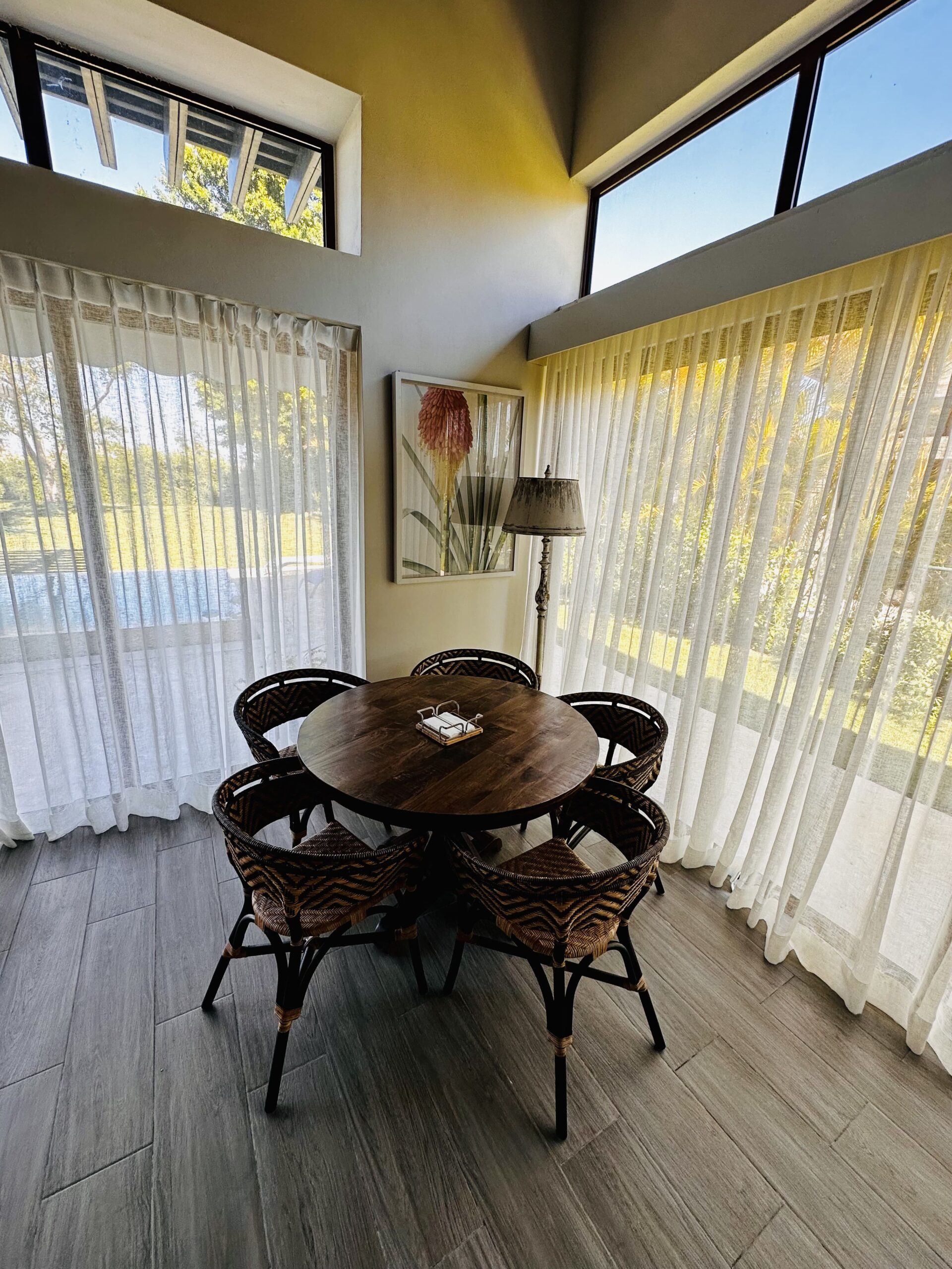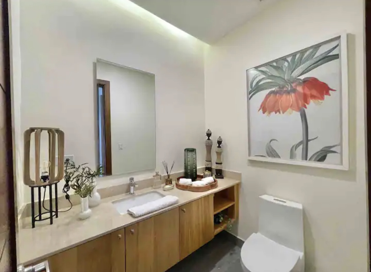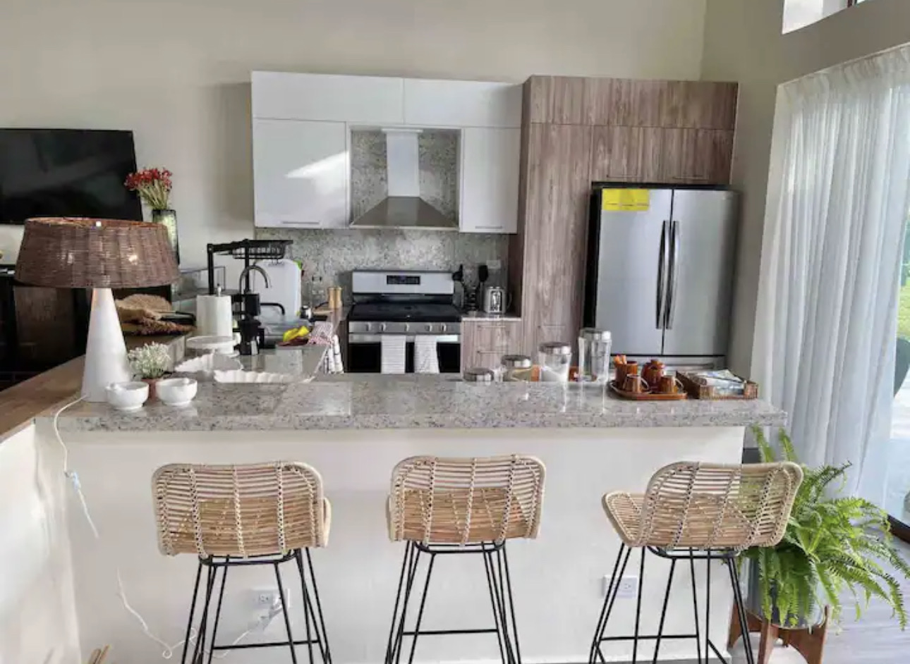 La villa cuenta con tres habitaciones, todas equipadas con aire acondicionado, baños completos y armarios empotrados. Además, hay un baño en el área social. La amplia sala de estar, el comedor y la cocina completamente equipada están decorados de una manera acogedora y chic, creando un ambiente relajante y sofisticado.